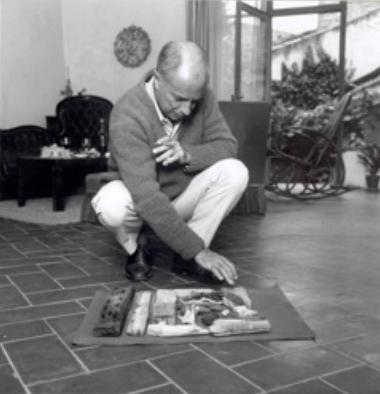 Claude Simon composant des bois flottés dans sa maison de Salses. Photographie de Claude Nourric