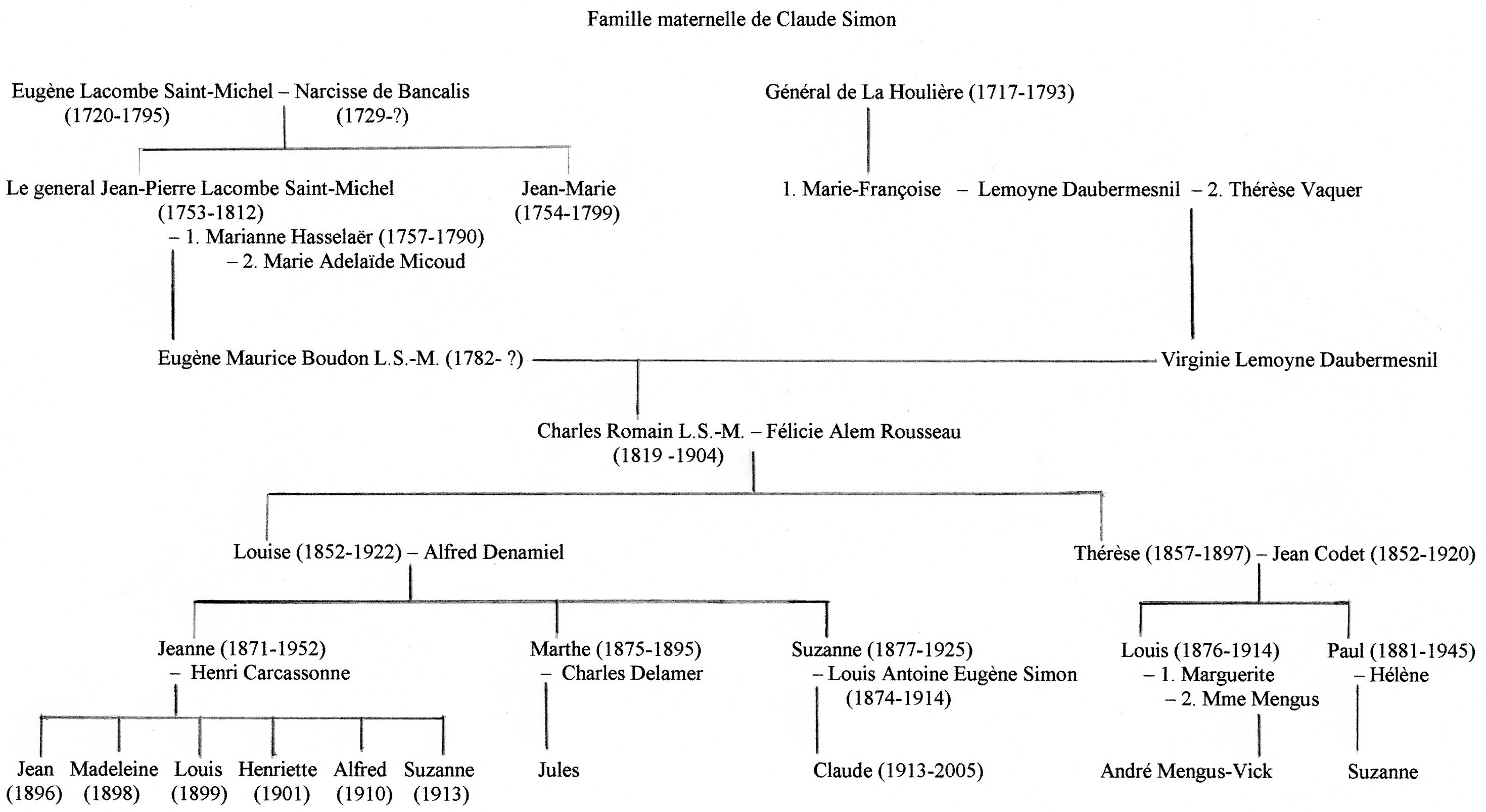 Dans la trace mémorielle de l’ascendance maternelle de Claude Simon, le général Jean-Pierre Lacombe-Saint-Michel, dont le petit-fils, Romain, sera l’arrière-grand-père maternel de Claude, tient une part importante.