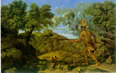 Simon a présenté la figure du géant aveugle de Poussin comme « une allégorie de l’écrivain avançant à tâtons dans la forêt des signes vers … eh bien, justement le soleil levant ( c’est le titre entier du tableau). Or Orion est une constellation et quand le soleil sera levé, il sera, lui, effacé [16]. » La référence au tableau de Poussin fait l’objet de plusieurs études approfondies de Brigitte Ferrato-Combe et de Mireille Calle-Gruber [17] qui en soulignent le caractère générateur : amorce thématique pour les séquences descriptives-narratives du texte (disproportion du géant auprès de plus petits ; démarche hésitante des personnages affaiblis par la maladie ou l’âge) et « élément structurant essentiel » puisqu’il ponctue le cheminement directeur de tout le livre. Je voudrais m’inscrire dans cette réflexion pour souligner quelques points caractéristiques de l’usage allégorique pluriel que fait Simon de cette illustration.