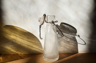 Il y eut comme une fulgurance qui composait une suite à une question : Claude Simon, la première fois ?, au lendemain d’une promenade dorée au Jardin des plantes. Sur les débords du lambris d’appui, le soleil est venu, l’espace d’un instant, frapper deux objets de verre en lumière rasante contre le mur de chaux. Il y avait un vase à fleurs, jaune comme l’or des feuilles des immenses Ginkos du Jardin (mémoire vive des couleurs en imprégnation) et un flacon de verre à bouchon entortillé de fer. Les deux ombres projetées faisaient gardes obliques autour du flacon. Stries, irisations, feuilletés-étirés, la matière de l’objet en stratigraphies projetées, explosion de passé en lumière solaire.