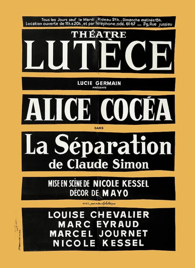 Présentée pour la première fois à Paris, au Théâtre de Lutèce, le 7 mars 1963, dans une mise en scène de Nicole Kessel, La Séparation est la seule pièce de théâtre écrite par Claude Simon.