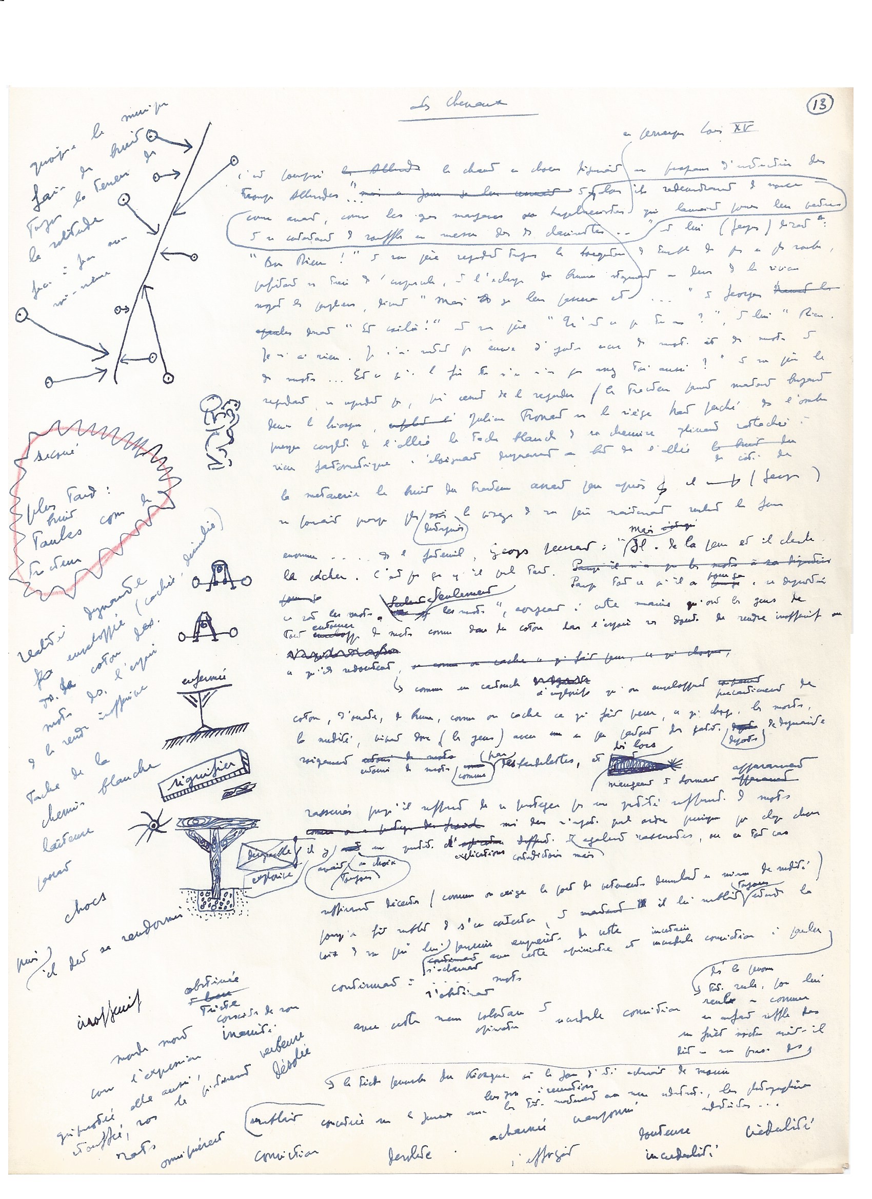 Cette page du manuscrit de La Route des Flandres date de l’époque où Simon envisageait d’appeler son roman « Les chevaux », en jeu de mots avec « l’écheveau ». Elle est donc antérieure à l’été 59, datant probablement de l’hiver 1958. Le bloc d’où elle provient est d’un format assez peu courant (21 x 26,5). Largement retravaillée par la suite, elle correspond à une séquence située dans la première partie du roman. En voici la version définitive :