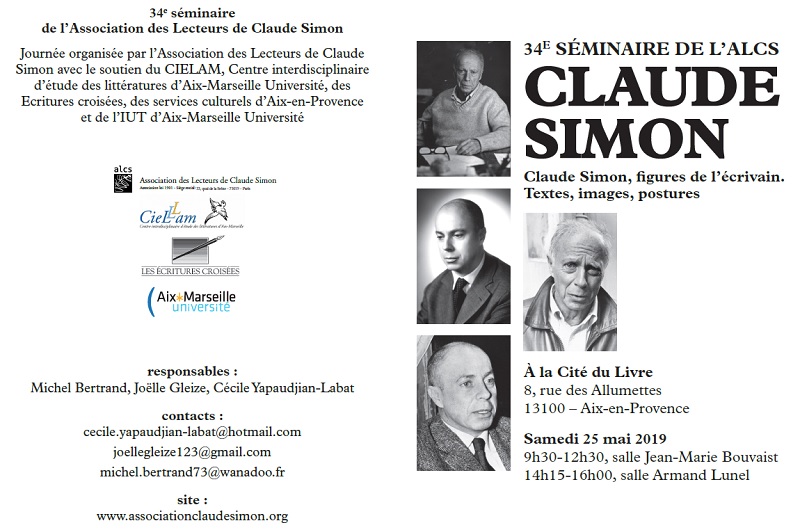 Journée organisée par l’Association des Lecteurs de Claude Simon avec le soutien du CIELAM, Centre interdisciplinaire d’étude des littératures d’Aix-Marseille Université, des Écritures croisées, des services culturels d’Aix-en-Provence et de l’IUT d’Aix-Marseille Université.